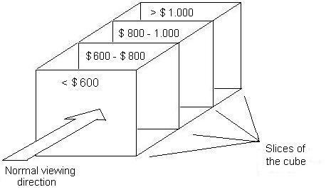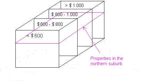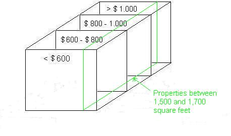 "Ap3" is "Apartment 3" and "Hs5" is house number 5 in her catalogue. That is a 2 dimensional view of the information, the dimensions being "Size in square feet" and "region". A client can look at this table and see that there is an apartment in the south of town of the size he is looking for, "900-1,100 square feet". The price is a third aspect (or dimension). So really you need a cube to show the information: