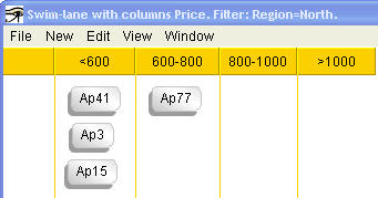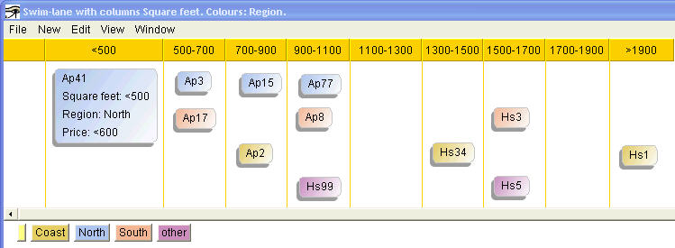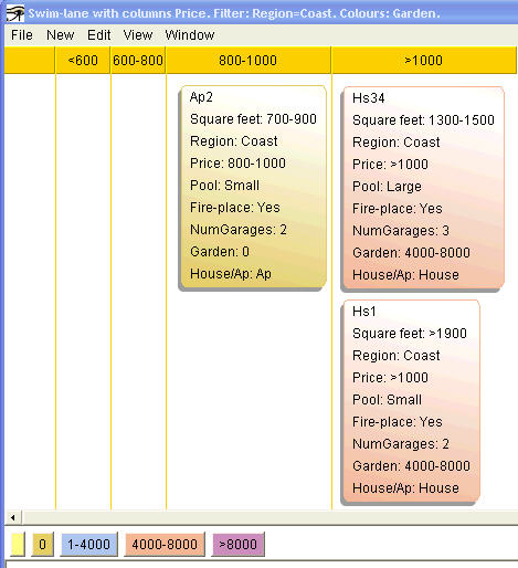 Generally, such information has more than these 3 aspects. Other important details might be the size of the garden (if there is one), whether the property has an open fire-place, the number of garages, whether it has a swimming pool etc. In this example, it would also make sense to have an aspect "House or apartment". Once this information has been entered for all the properties, it is very easy to see what is available according to different criteria: maybe a client is looking for something on the coast with a reasonable garden and wants to know the price categories. In the following screenshot a "filter" ensures that only properties on the coast are shown. The colors indicate the size of the garden and the columns are the price categories: