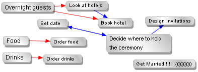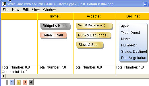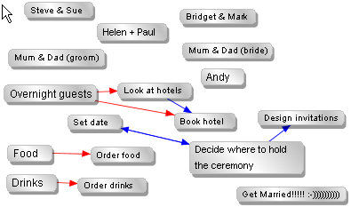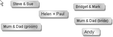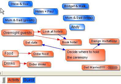 Plan your wedding or another celebrationYou've got lists of guests, lists of suppliers, dates, people who are going to help - and a few other lists and notes as well - maybe special dietary considerations (vegetarians etc.) and their wishes regarding where they are going to spend the night. You might have lists showing who is driving whom to the ceremony and then to the reception. And thence to the hotel or wherever. You'll certainly have a list showing who has been invited, who has accepted, who has declined and who you have to chase up. What happens if somebody has to cancel? You can go through all your lists - and if there's a phone-call while you're half way through correcting your lists? Disaster. Using i2Brain you input the name of each guest exactly once. You input the data for that person, then look at all the data from different view-points: how many vegans are coming? Who needs a lift back from the reception etc. Here's an example of how such a plan is created. Let's start with a few guests: